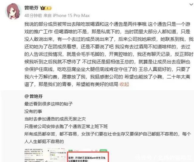 她发文称,公司多次强迫女艺人参加上午饭局,比如多位SNH48女团成员现身三亚游艇,陪王思聪过生日。
